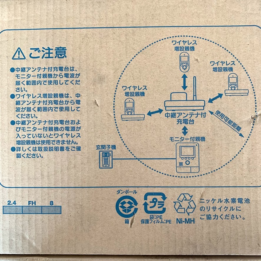 ●ワイヤレス増設親機(WF-2HD)・・・電源:DC3.6V(ニッケル水素電池)、通話方式:ハンズフリー/プレストーク通話、モニター:2.5型TFTカラー液晶、使用時間:待ち受け時間 約180時間・連続通話時間 約1時間(※約10時間充電した状態で使用周囲温度が20℃のとき)、充電時間:約10時間、使用可能距離:見通し距離約100m(ワイヤレス増設親機と中継アンテナ付充電台の間)